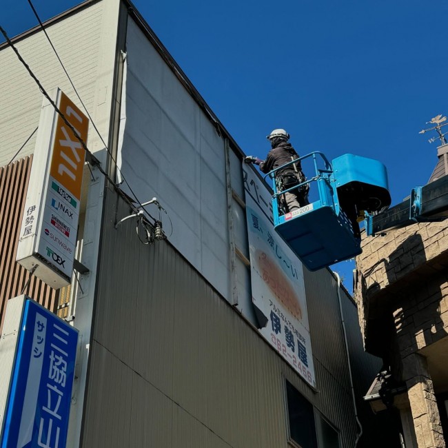 伊勢屋様の社屋壁面にマド本舗伊勢屋舞鶴店のパネルサインを設置させていただきました🙇🏻‍♂️