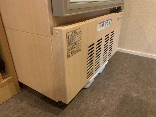 業務用の冷蔵庫(本体カラー:白)をお店の雰囲気に調和させるために木目のダイノックシートを貼りました。